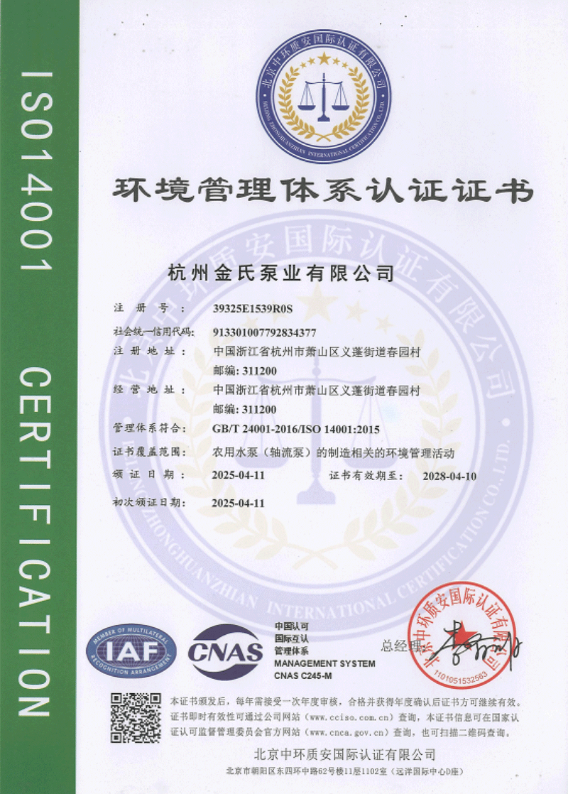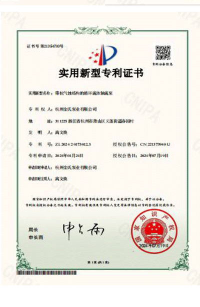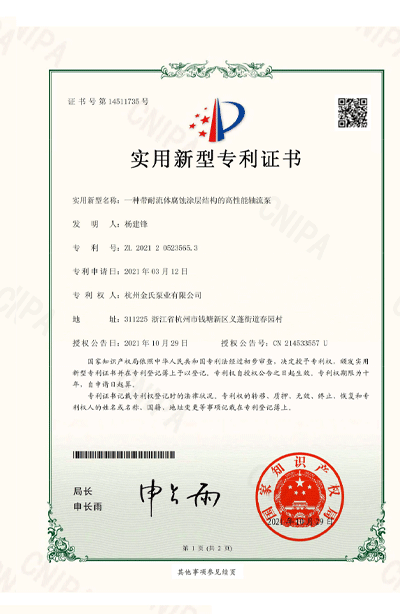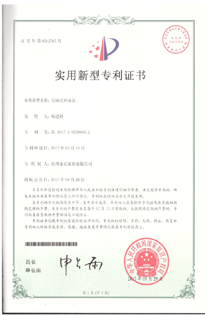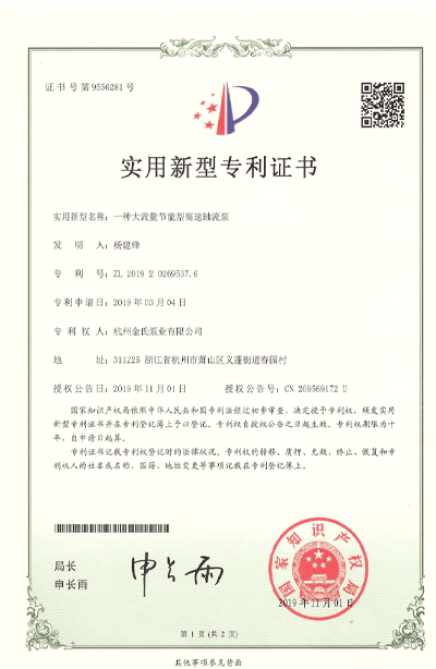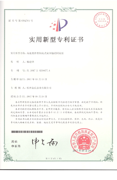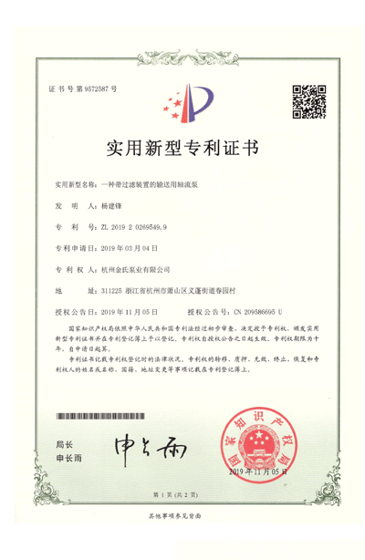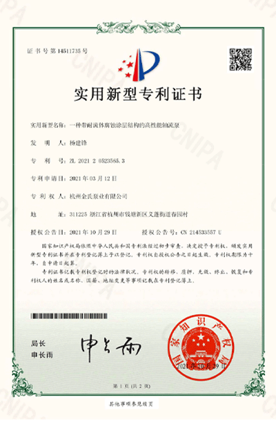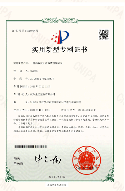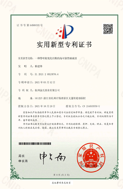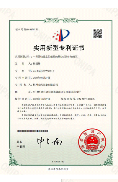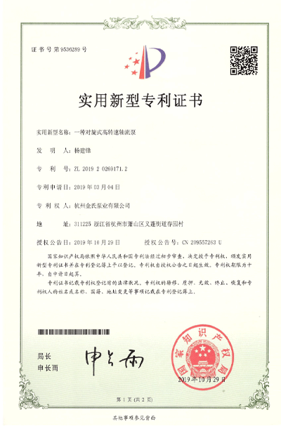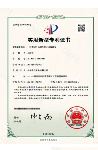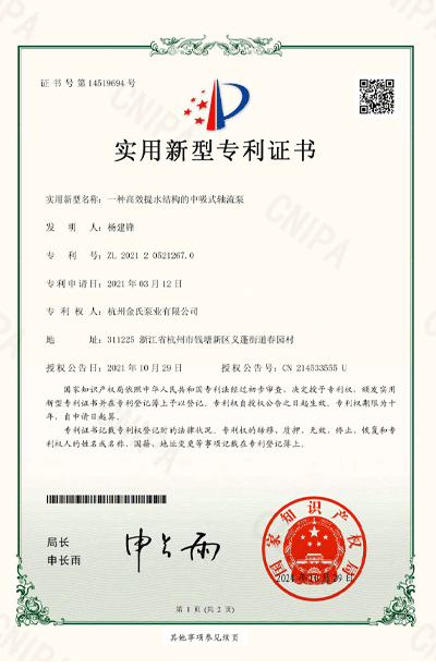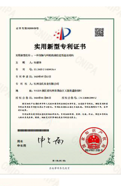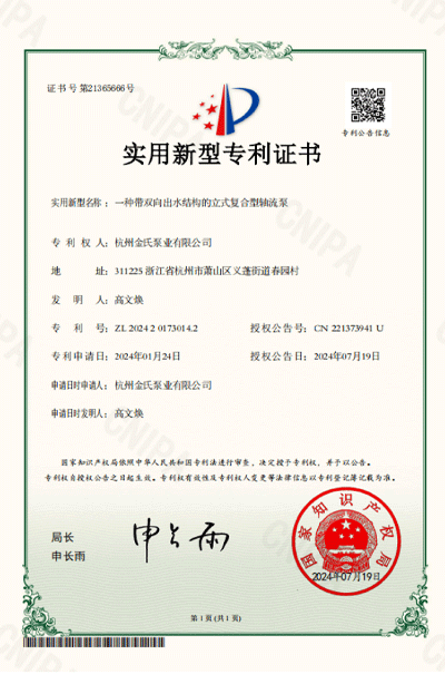 杭州金氏泵业有限公司在轴流泵领域拥有40多项专利技术,涵盖双向出水结构、抗气蚀结构、高比转速检测设备等多个创新方向。